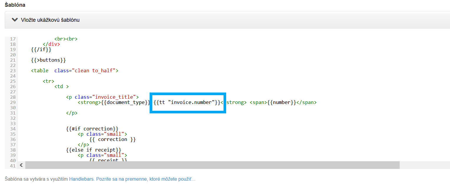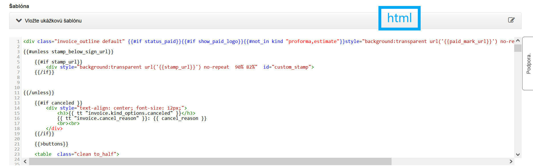 Na vykonanie úpravy alebo zmeny DEFAULT šablóny je nutné prejsť do menu Nastavenia - Nastavenie účtu - Fakturačné šablóny a kliknúť na "Pridať novú šablónu" Príklady šablón faktúr si môžete stiahnuť z Github: HTML: default.hbs.html CSS: default.css Na to, aby mala Default šablóna vzhľad ako šablóna Blue, je nutné k nej použiť CSS blue.css a presunúť jeden prvok na iné miesto: