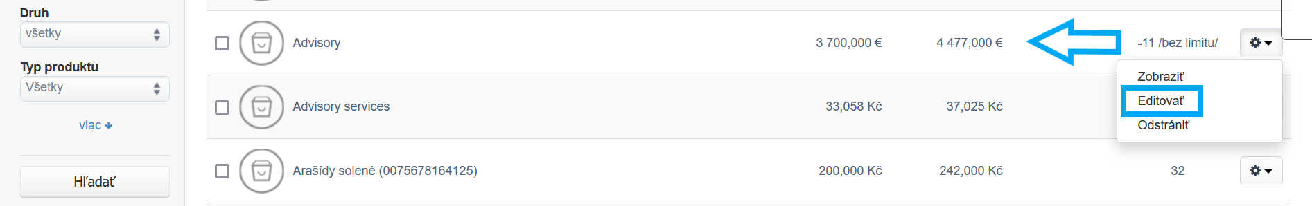 - pomocou ozubeného kolesa vyberte možnosť Upraviť u vybraného produktu zo zoznamu.