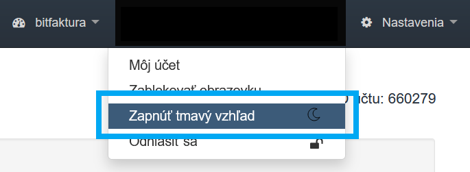 Ako povoliť tmavý režim v BitFakture?V pravom hornom rohu hneď pod e-mailovou adresou sa nachádza prepínač, ktorý umožňuje prepínať medzi jednotlivými režimami podľa vašich preferencií. Kliknutím na Zapnúť tmavý vzhľad aktivujeme tmavý režim.