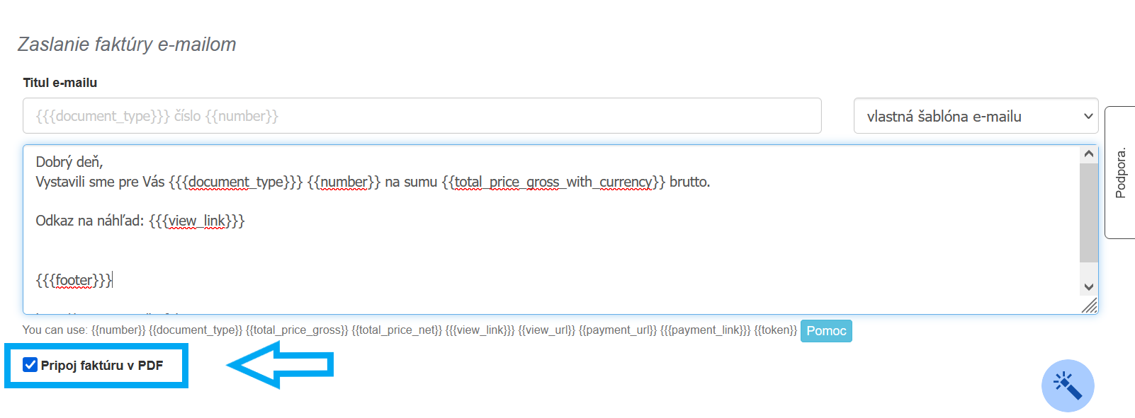Aktivuje sa pri použití tlačidla Odoslať vo vyskakovacom menu náhľadu faktúry. Formulár obsahuje polia ako: Odosielateľ, E-mail zákazníka, Kopírovať do, Predmet, Obsah.