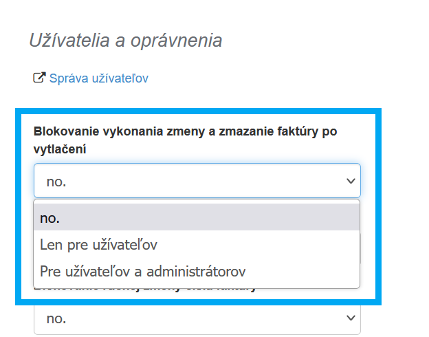 Prejdite na Nastavenia - Nastavenia účtu - Konfigurácia - Užívatelia a oprávnenia - Blokovanie vykonania zmeny a zmazanie faktúry po vytlačení.