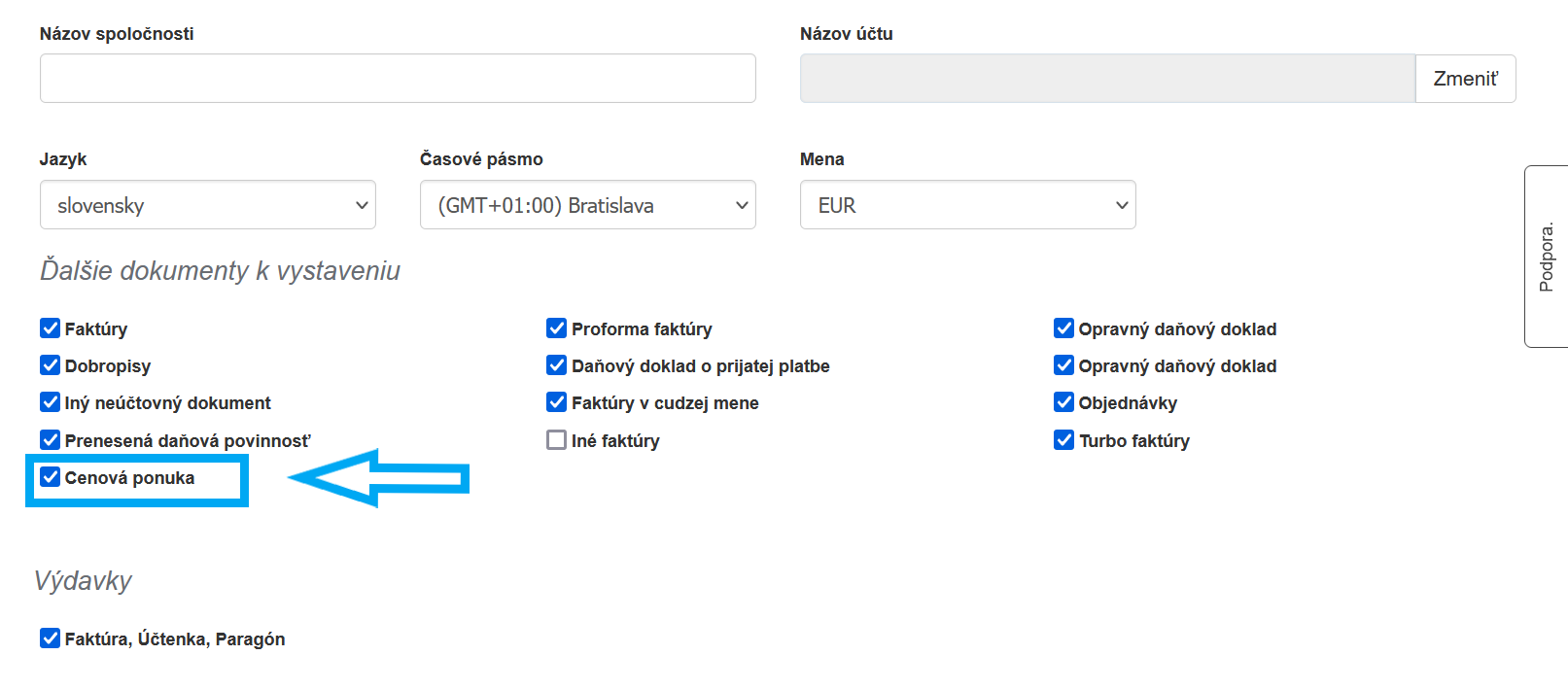 Pre vystavenie dokladu sa najskôr uistite, že je daný typ dokladu spustený v sekcii Ďalšie dokumenty na vystavenie. Ak to chcete vykonať, prejdite do ponuky Nastavenia> Nastavenia účtu a začiarknite políčko Cenová ponuka. Po začiarknutí políčka kliknite na Uložiť v spodnej časti stránky.