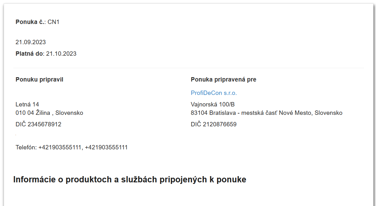 Po vyplnení všetkých údajov v editačnom formulári dokladu a kliknutí na uložiť obdržíte doklad cenovej ponuky. Vzorový dokument môže vyzerať takto: