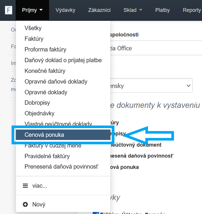 Ak chcete vystaviť doklad, prejdite na hlavnú stránku a stlačte tlačidlo Cenová ponuka. Cez záložku Príjmy je možné tiež prejsť do zoznamu dokladov a z tejto úrovne zahájiť vystavenie dokladu (na zozname dokladov sa objaví voľba Pridať).