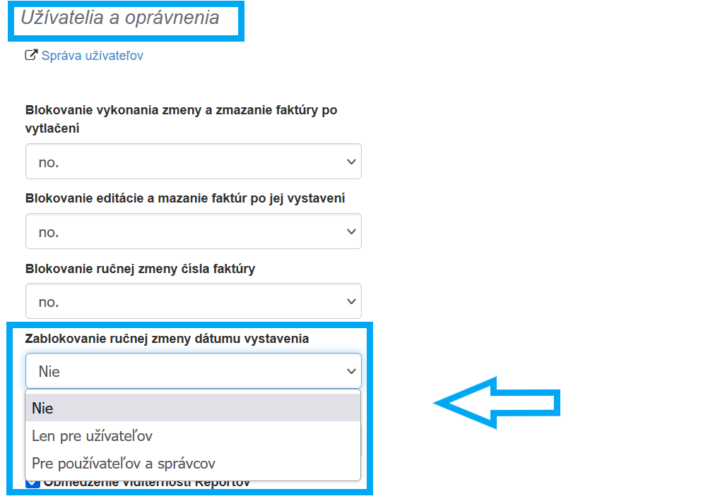 Je potrebné urobiť nasledujúce: Nastavenia> Nastavenia účtu> Konfigurácia> Užívatelia a oprávnenia> Zablokovanie ručnej zmeny dátumu vystavenia.