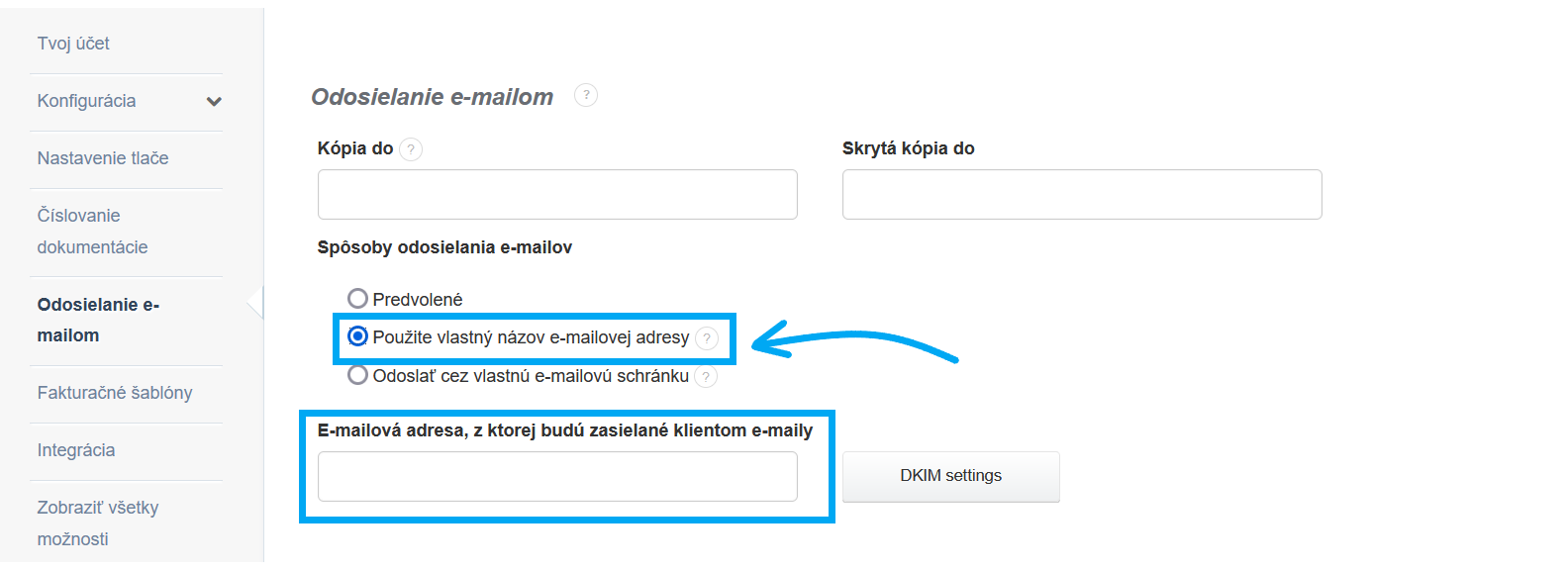 - pokiaľ chcete povoliť možnosť odpovede zákazníkovi vo východiskovej možnosti odosielania e-mailom tak, aby bola správa zasielaná na zvolenú adresu Užívateľa faktúry, ktorý zasiela faktúru e-mailom (Predávajúci), zadajte v rubrike E-mailová adresa, z ktorej budú zasielané klientom e- maily - e-mailovú adresu, ktorú chcete používať.