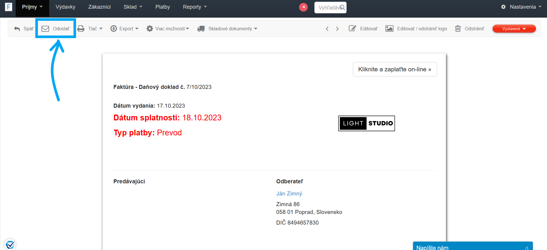 BitFaktura ponúka možnosť zaslania faktúry e-mailom priamo zákazníkovi, takže doklad môžete doručiť ihneď, bez nutnosti jeho tlače. Predvolený spôsob odoslania dokumentu zahŕňa zaslanie odkazu na náhľad dokumentu vygenerovaný v BitFakture, odkiaľ je možné dokument stiahnuť. K správe, ktorú odosielate, však môžete pripojiť dokument PDF. Ak chcete odoslať faktúru v PDF, kliknite na Odoslať na obrazovke náhľadu faktúry a potom vyberte Priložte faktúru v PDF.