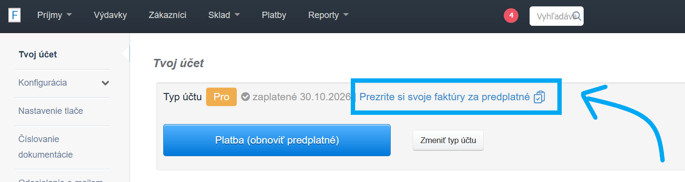 Ak však z nejakého dôvodu vyššie uvedený e-mail zmažeme alebo je ťažké ho nájsť, môžete si faktúru kedykoľvek ľahko stiahnuť zo svojho účtu na BitFakture. Ak chcete stiahnuť faktúru, postupujte podľa dvoch jednoduchých krokov:1) Vyberte Nastavenia > Nastavenia účtu;2) Vo svojom účte na rovnakej úrovni ako daný typ účtu nájdete frázu Prezrite si svoje faktúry za predplatné. Po kliknutí naň prejdete na Zákaznícky panel s Vašimi existujúcimi faktúrami za predplatné v systéme.
