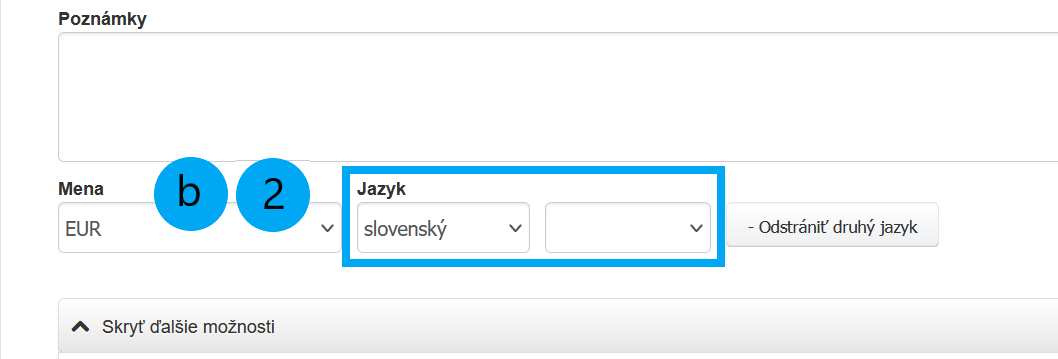 BitFaktura umožňuje svojim používateľom vystavovať faktúry v mnohých jazykoch. Ak: a) vystavujete faktúru v inom jazyku ako slovenčina - pri vytváraní alebo úprave faktúry, kliknite na tlačidlo Jazyk, ktoré sa nachádza hneď nad tlačidlom Ďalšie možnosti, vyberte jeden z niekoľkých desiatok cudzích jazykov (a) b) vystavujete faktúru v dvoch jazykoch (dvojjazyčnú) - pri vytváraní alebo úprave faktúry - pomocou riadku Jazyk a tlačítka Pridať druhý jazyk (b1) tesne nad rámčekom Ďalšie možnosti , vyberte dve z niekoľkých desiatok možností cudzieho jazyka (b2)