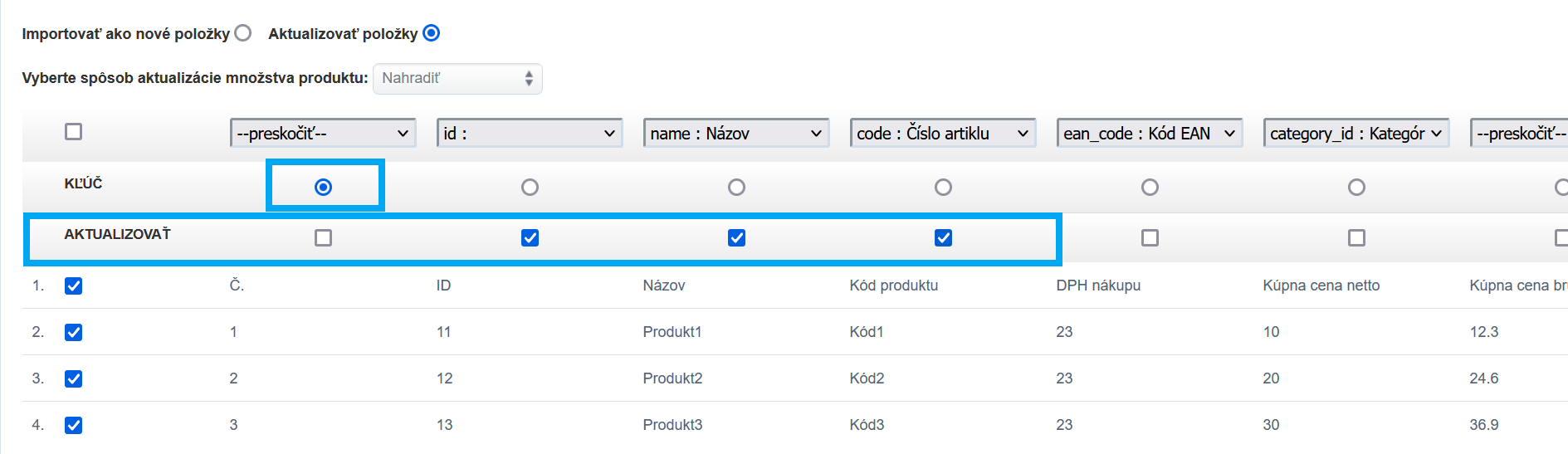Ďalšia sekcia AKTUALIZÁCIE sa týka tých parametrov produktu, ktoré majú byť aktualizované daným importom produktu, v tomto prípade je to: Kód tovaru, Cena nákupu bez DPH a cena nákupu s DPH.