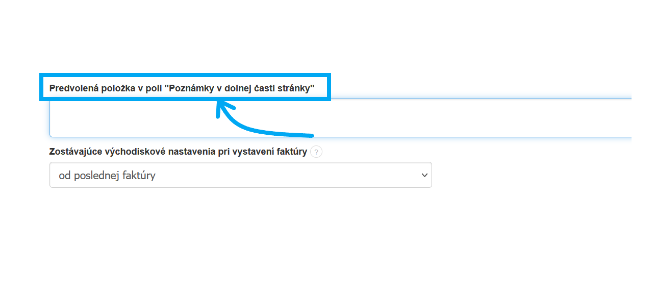 V BitFakture je možné nastaviť východiskový zápis vo forme komentára v poli (rovnako ako v poli komentáre k faktúram a poznámke na druhej strane). Navyše môžete tiež nastaviť podobné komentáre úpravou každého vydaného dokladu. Predvolený záznam v päte faktúry je možné zmeniť v menu Nastavenia>Nastavenia účtu>Konfigurácia>Predvolená položka v poli "Poznámky v dolnej časti stránky".